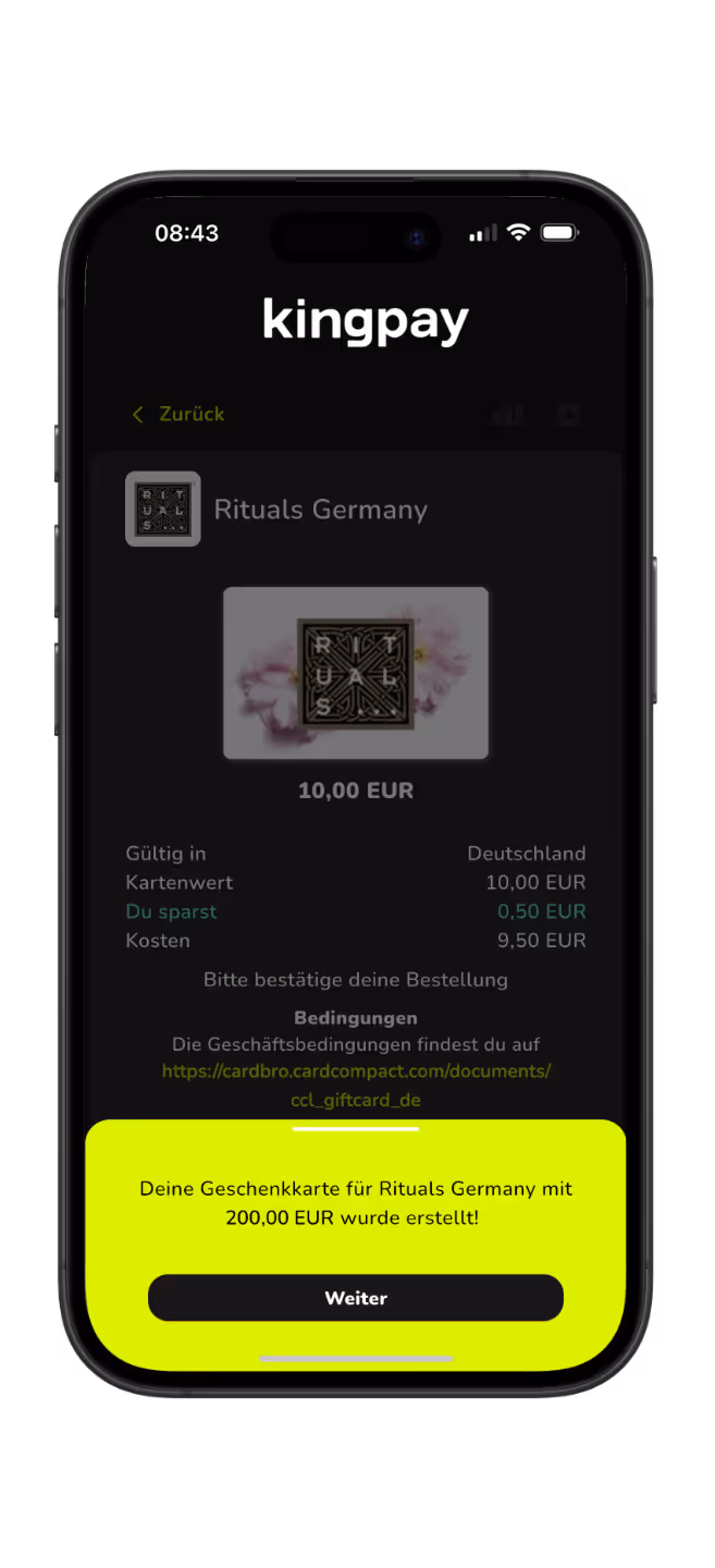 Bezahle mit deiner kingpay Mastercard Karte und erhalte die Geschenkkarte sofort in digitaler Forml in deiner kingpay App.