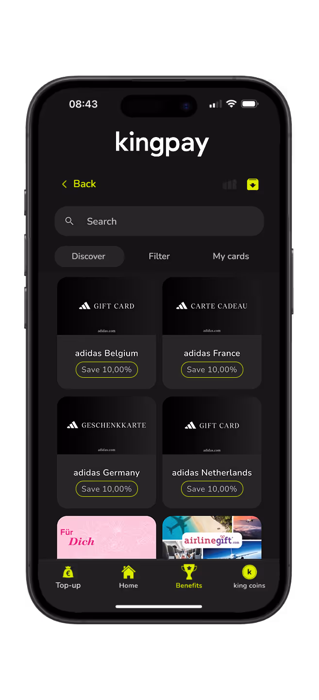 Entdecke unser breites Angebot an digitalen Geschenkkarten zu Sonderpreisen. Ob für Shopping, Streaming, Gaming oder Reisen – bei kingpay findest du attraktive Rabatte für die bekanntesten Marken. Einfach in der App kaufen, sofort nutzen und clever sparen!